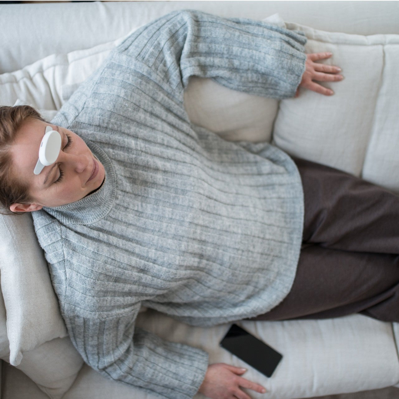 Attach Relivia centered on your forehead with the included electrode strap. Designed for comfort – you can use it at home, at work or on the go.