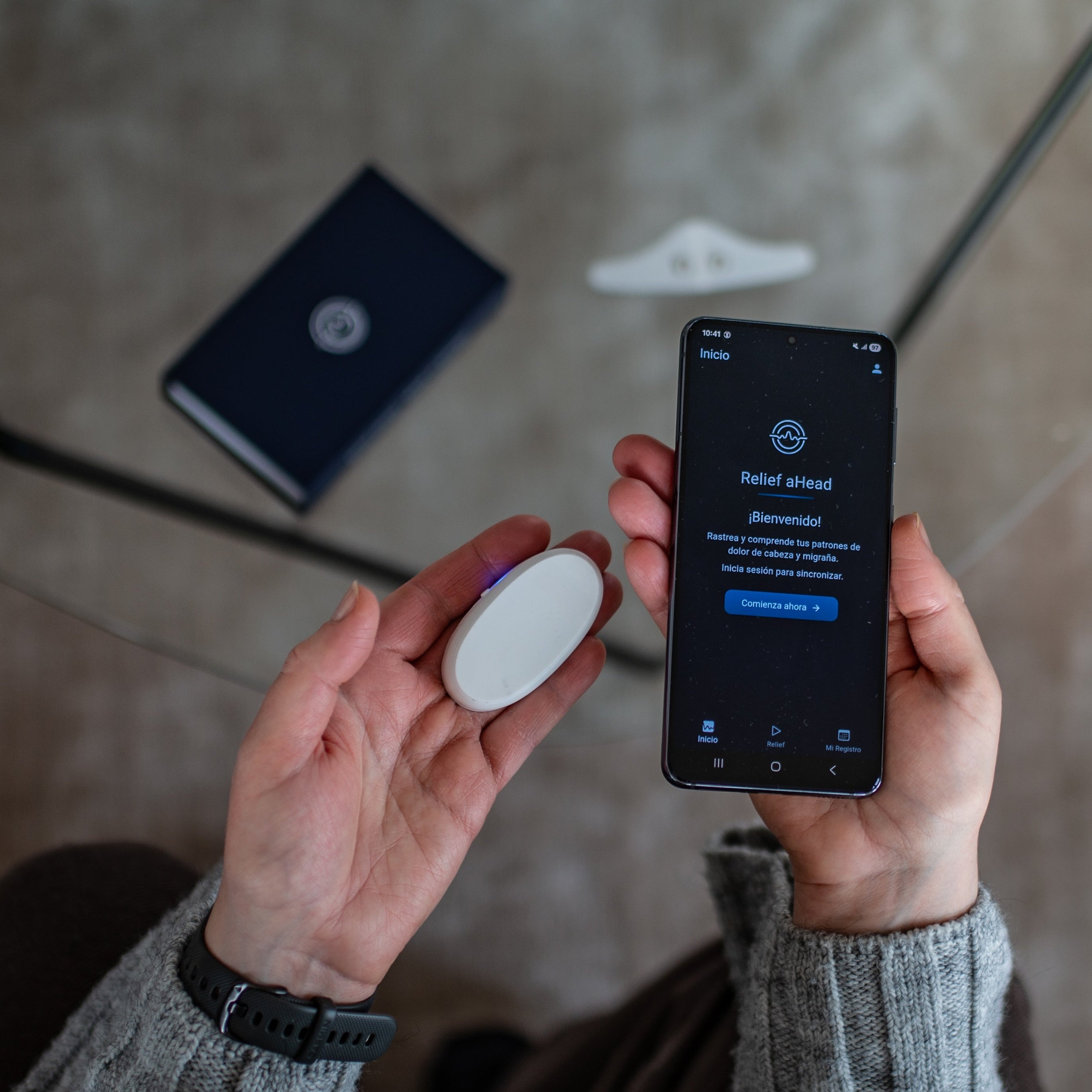 Start a session via the Relivia app. Choose your treatment mode – acute relief or prevention. The AI automatically adjusts the intensity to your needs.